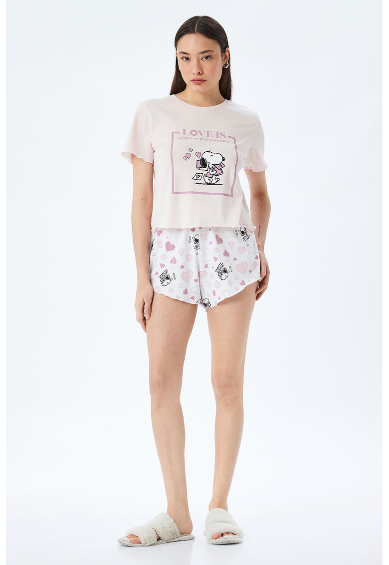 Caracteristici Tip produs: pijama Culoare: roz Material: bumbac Decolteu: la baza gatului Croiala: regular fit Lungime maneca: maneca scurta Talie: talie ajustabila cu snur Lungime pantaloni: scurti Detalii: imprimeu snoopy dog Sistem inchidere: fara inchidere Compozitie Exterior: 100% bumbac