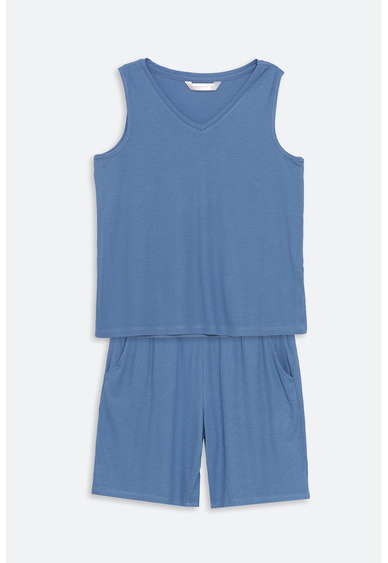 - viscoza Imprimeu: uni Decolteu: in v Croiala: regular fit Lungime maneca: fara maneca Lungime pantaloni: scurti Buzunare: laterale Compozitie Exterior: 97% viscoza