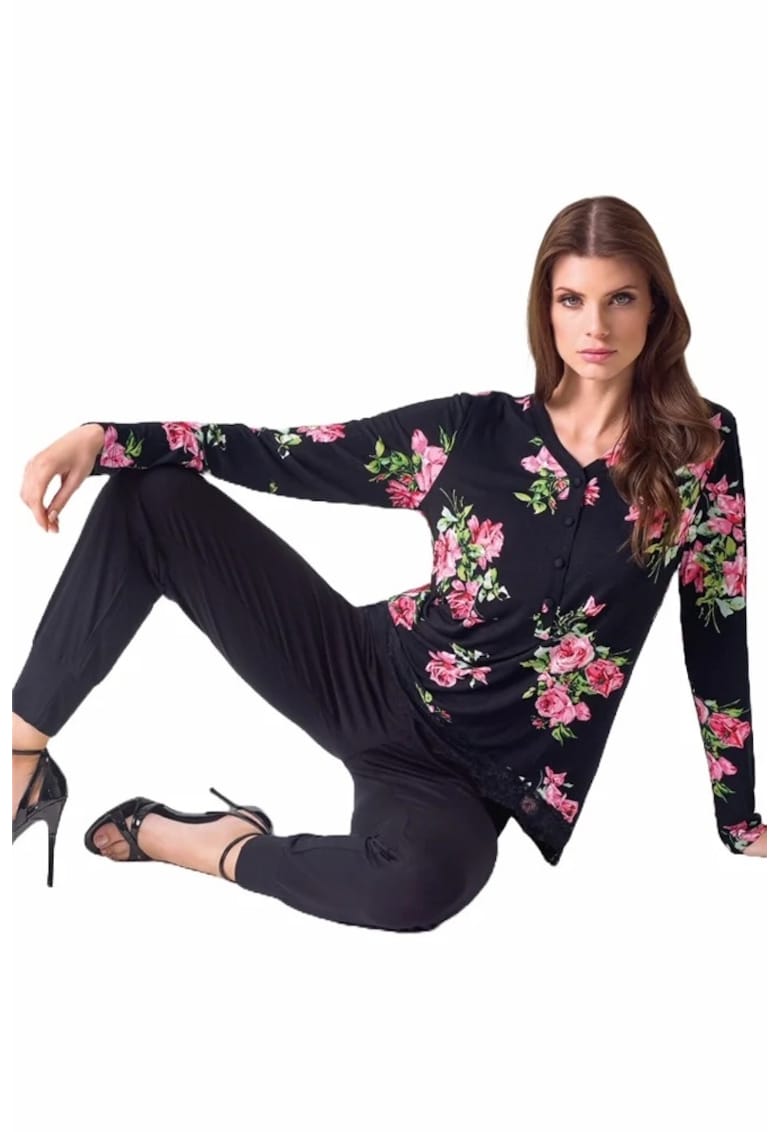 Caracteristici Tip produs: pijama Culoare: negru Material: viscoza Imprimeu: uni Decolteu: fenta cu nasturi Croiala: regular fit Lungime maneca: maneca lunga Lungime pantaloni: lungi Sistem inchidere: fara inchidere Compozitie Exterior: 95% viscoza