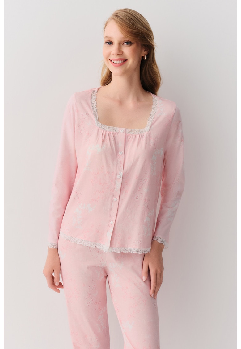 - roz pastel Material: bumbac Imprimeu: uni Decolteu: patrat Croiala: regular fit Lungime maneca: maneca lunga Lungime pantaloni: lungi Sistem inchidere: fara inchidere Compozitie Exterior: 100% bumbac