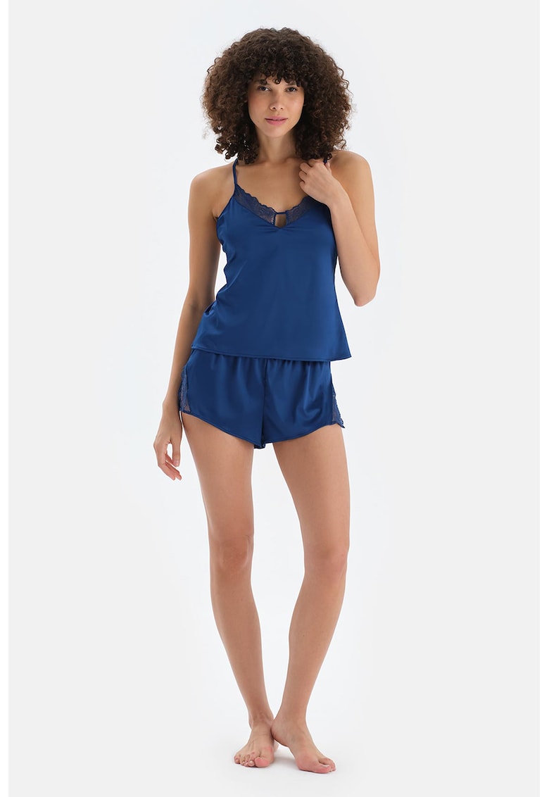Caracteristici Tip produs: pijama Culoare: indigo Material: sintetic Imprimeu: uni Decolteu: in v Croiala: regular fit Lungime maneca: fara maneca Lungime pantaloni: scurti Sistem inchidere: fara inchidere Compozitie Exterior: 92% poliester