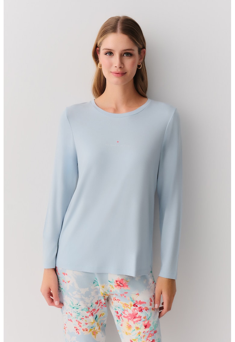 - modal Imprimeu: floral Decolteu: rotund Croiala: regular fit Lungime maneca: maneca lunga Talie: medie Lungime pantaloni: lungi Compozitie Exterior: 95% modal