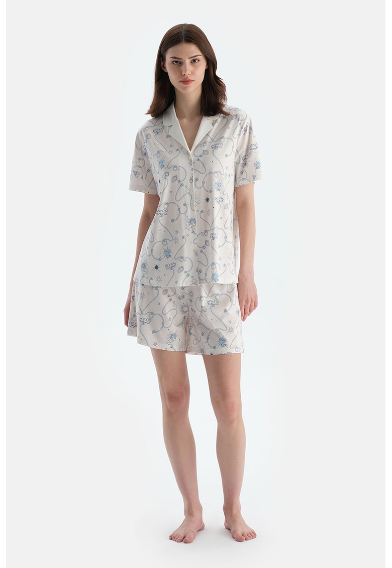 - modal Imprimeu: grafic Decolteu: in v Guler: cu revere decupate Croiala: lejer Lungime maneca: maneca scurta Talie: medie Lungime pantaloni: scurti Sistem inchidere: fara inchidere