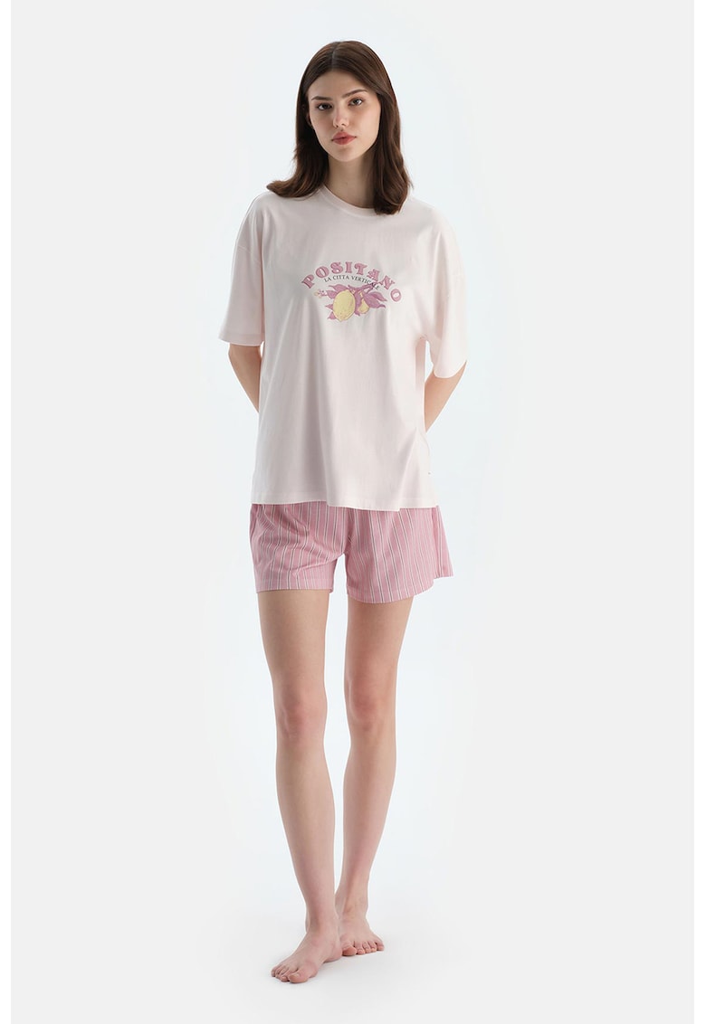 - grafic Decolteu: la baza gatului Croiala: lejer Maneci: cazute Lungime maneca: maneca scurta Talie: medie Lungime pantaloni: scurti Sistem inchidere: fara inchidere Compozitie Exterior: 50% modal
