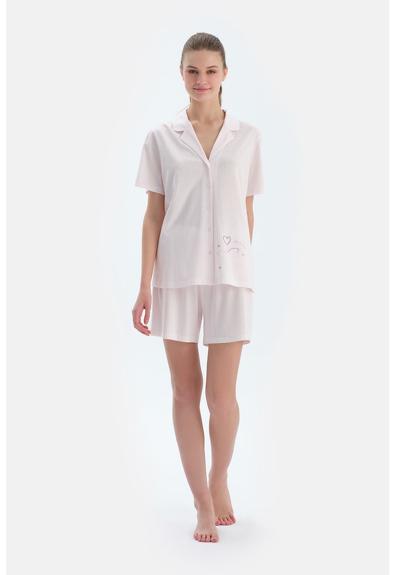 - modal Imprimeu: dungi Guler: rotunjit Croiala: regular fit Lungime maneca: maneca scurta Talie: inalta Lungime pantaloni: scurti Sistem inchidere: nasturi Compozitie Exterior: 50% modal