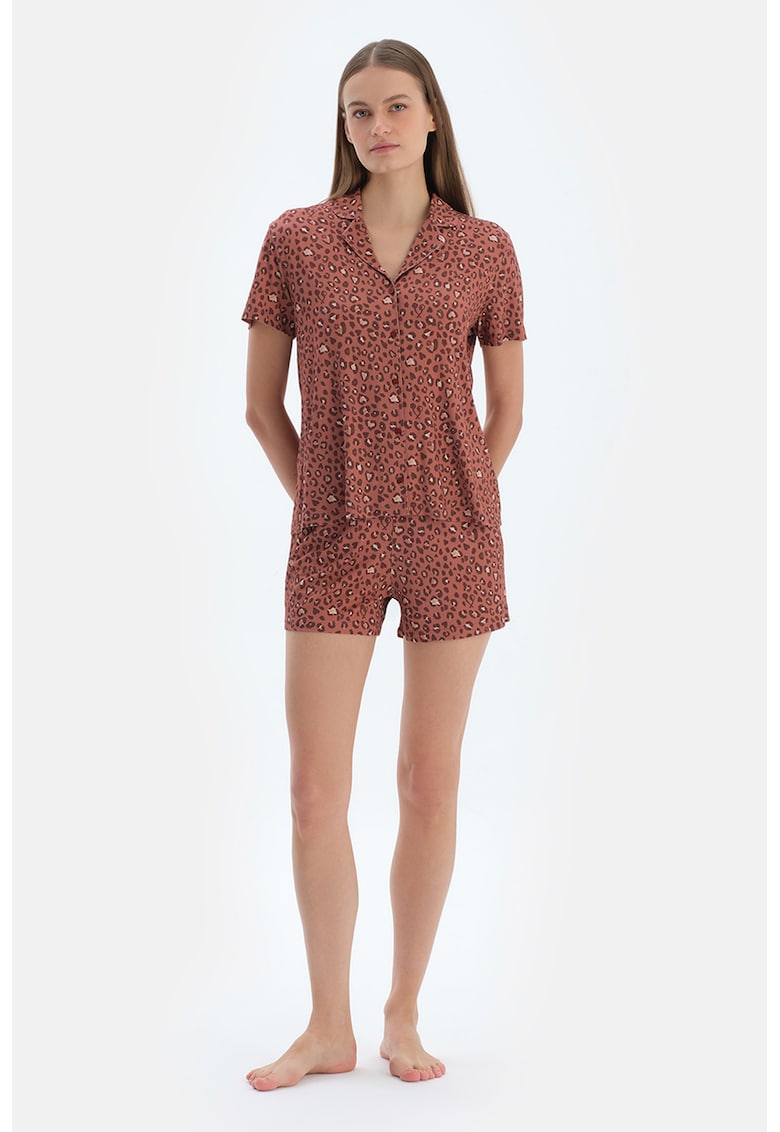- modal Imprimeu: animal print Decolteu: in v Guler: cu revere decupate Croiala: regular fit Lungime maneca: maneca scurta Talie: inalta