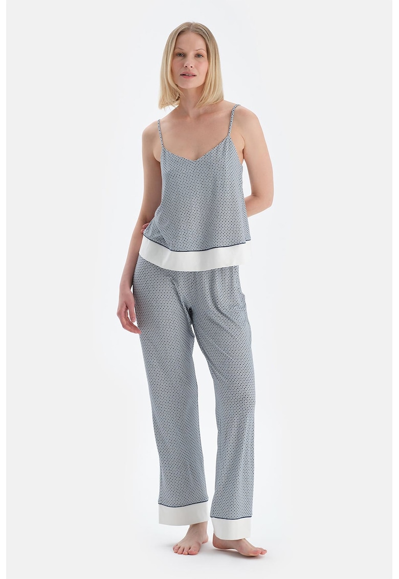 - modal Imprimeu: buline Decolteu: in v Croiala: regular fit Barete: inguste Lungime maneca: fara maneca Talie: medie Lungime pantaloni: lungi Detalii: banda elastica in talie cu snur pentru ajustare Sistem inchidere: fara inchidere Compozitie Exterior: 50% bumbac