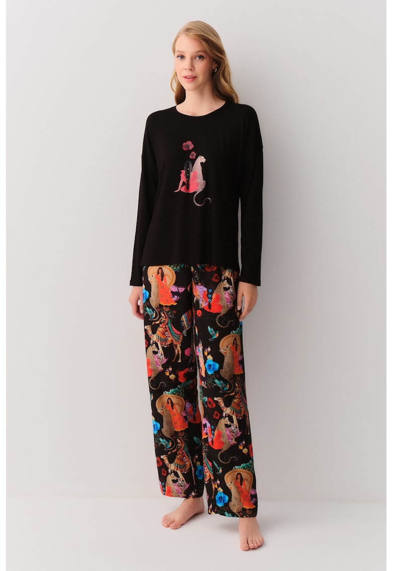 - rosu stins Material: viscoza Imprimeu: grafic Decolteu: rotund Croiala: lejer Lungime maneca: maneca lunga Lungime pantaloni: lungi Sistem inchidere: fara inchidere Compozitie Exterior: bluza: 95% viscoza