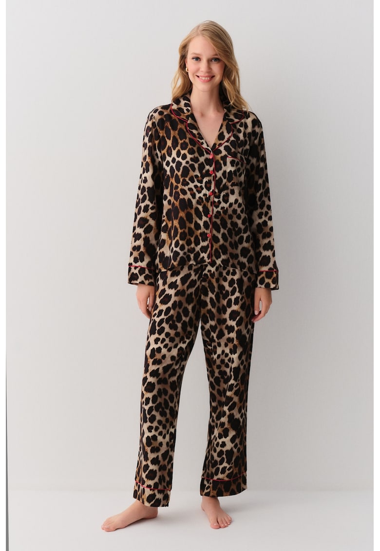- bej deschis Material: viscoza Imprimeu: animal print Guler: cu revere decupate Croiala: regular fit Lungime maneca: maneca lunga Talie: medie Lungime pantaloni: lungi Buzunare: unul aplicat pe piept Sistem inchidere: nasturi Compozitie Exterior: 100% viscoza