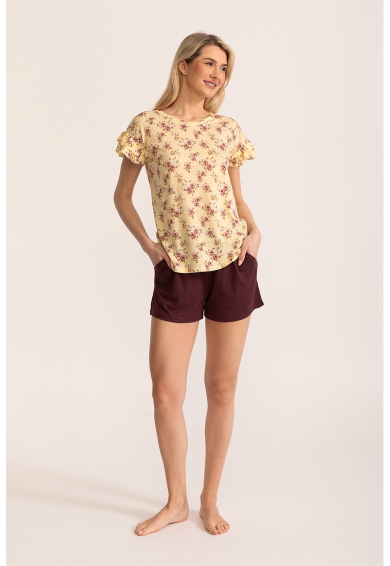 - fibre de bambus Imprimeu: floral Decolteu: rotund Lungime maneca: maneca scurta Talie: elastic Lungime pantaloni: scurti Buzunare: buzunare laterale Sistem inchidere: fara inchidere Compozitie Exterior: 70% bambus