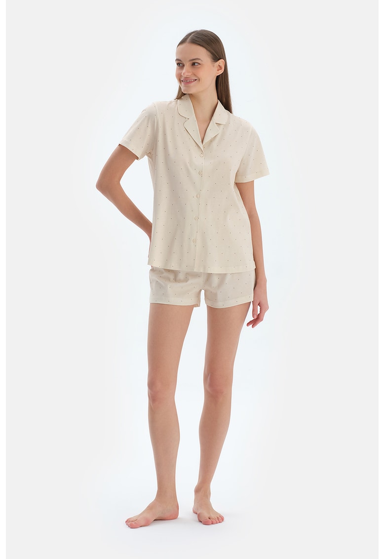 - modal Imprimeu: buline Guler: cu revere rotunjite Lungime maneca: maneca scurta Talie: inalta Lungime pantaloni: scurti Sistem inchidere: nasturi Compozitie Exterior: 50% modal