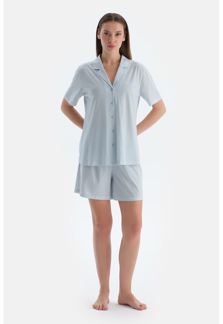 - modal Imprimeu: dungi Croiala: regular fit Lungime maneca: maneca scurta Talie: medie Lungime pantaloni: scurti Sistem inchidere: nasturi Compozitie Exterior: 50% modal