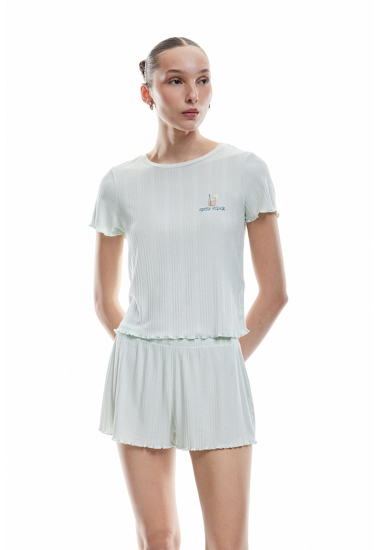 - modal Imprimeu: uni Decolteu: la baza gatului Croiala: regular fit Lungime maneca: maneca scurta Talie: medie Lungime pantaloni: scurti Detalii: aspect striat Sistem inchidere: fara inchidere Compozitie Exterior: 95% modal