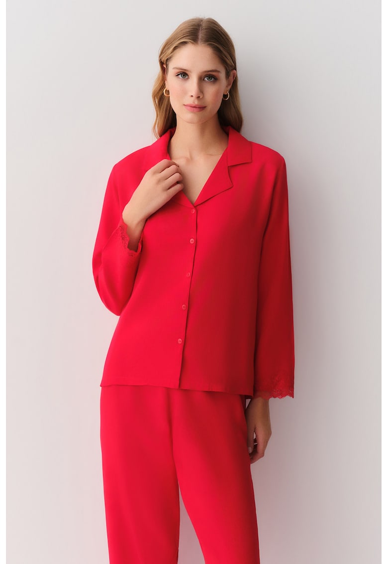 Caracteristici Tip produs: pijama Culoare: coral Material: viscoza Imprimeu: uni Decolteu: in v Croiala: lejer Lungime maneca: maneca lunga Talie: regular Lungime pantaloni: lungi Sistem inchidere: nasturi Compozitie Exterior: 100% viscoza Captuseala: 87% poliamida
