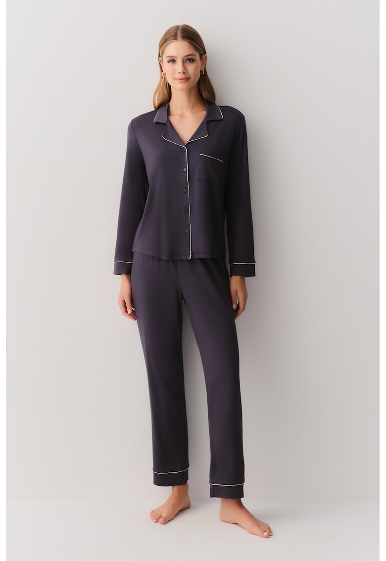 - viscoza Imprimeu: uni Decolteu: in v Guler: camasa: guler ascutit Croiala: regular fit Lungime maneca: maneca lunga Lungime pantaloni: lungi Sistem inchidere: nasturi Compozitie Exterior: 95% viscoza