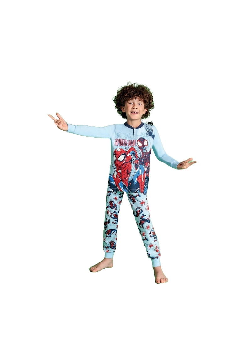 Caracteristici Tip produs: pijama Numar piese: 2 Culoare: albastru deschis Material: bumbac Imprimeu: logo Poveste/Personaj: spider-man Decolteu: fenta cu nasturi Lungime maneca: maneca lunga Sistem inchidere: fara inchidere Colectie: primavara