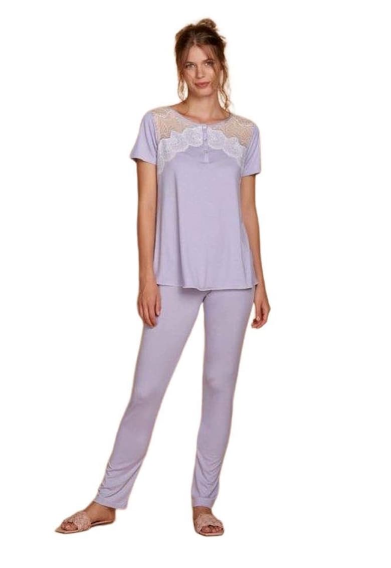 Caracteristici Tip produs: pijama Culoare: violet Material: viscoza Imprimeu: logo Decolteu: fenta scurta cu nasturi Croiala: regular fit Maneci: lungi Lungime maneca: maneca lunga Lungime pantaloni: lungi Detalii: 94% viscoza 6% elastan Sistem inchidere: fara inchidere