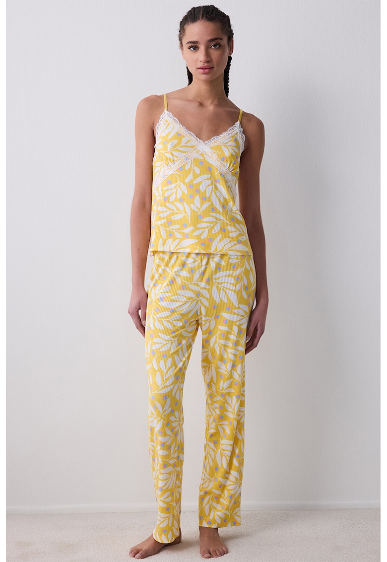 - viscoza Imprimeu: floral Decolteu: in v Croiala: regular fit Barete: 2 inguste Lungime maneca: fara maneca Lungime pantaloni: lungi Sistem inchidere: fara inchidere Compozitie Exterior: 93% viscoza