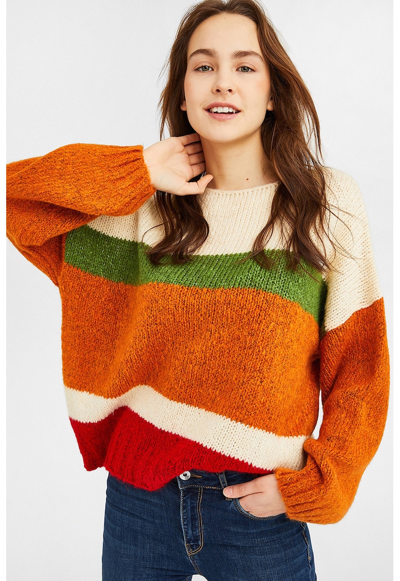 - acril Model: decolteu la baza gatului Croiala: lejer Sistem inchidere: fara inchidere Lungime maneca: maneca lunga Tip maneca: ampla Detalii: design colorblock Compozitie Exterior: 80% acrilic