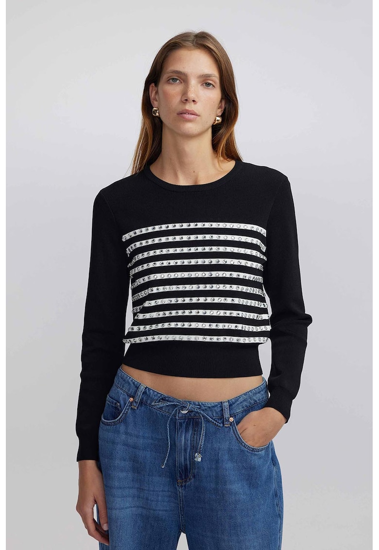 - poliamida Model: rotund Croiala: crop Sistem inchidere: fara inchidere Lungime maneca: maneca lunga Detalii: aplicatii din strasuri Compozitie Exterior: 52% poliamida