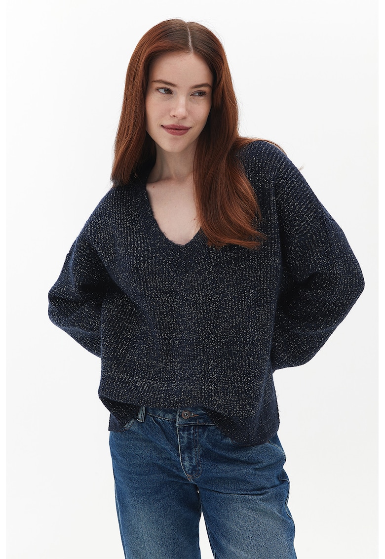 - acril Model: in v Croiala: lejer Sistem inchidere: fara inchidere Decolteu: in v Lungime maneca: maneca lunga Detalii: insertii de fire stralucitoare Compozitie Exterior: 69% acril