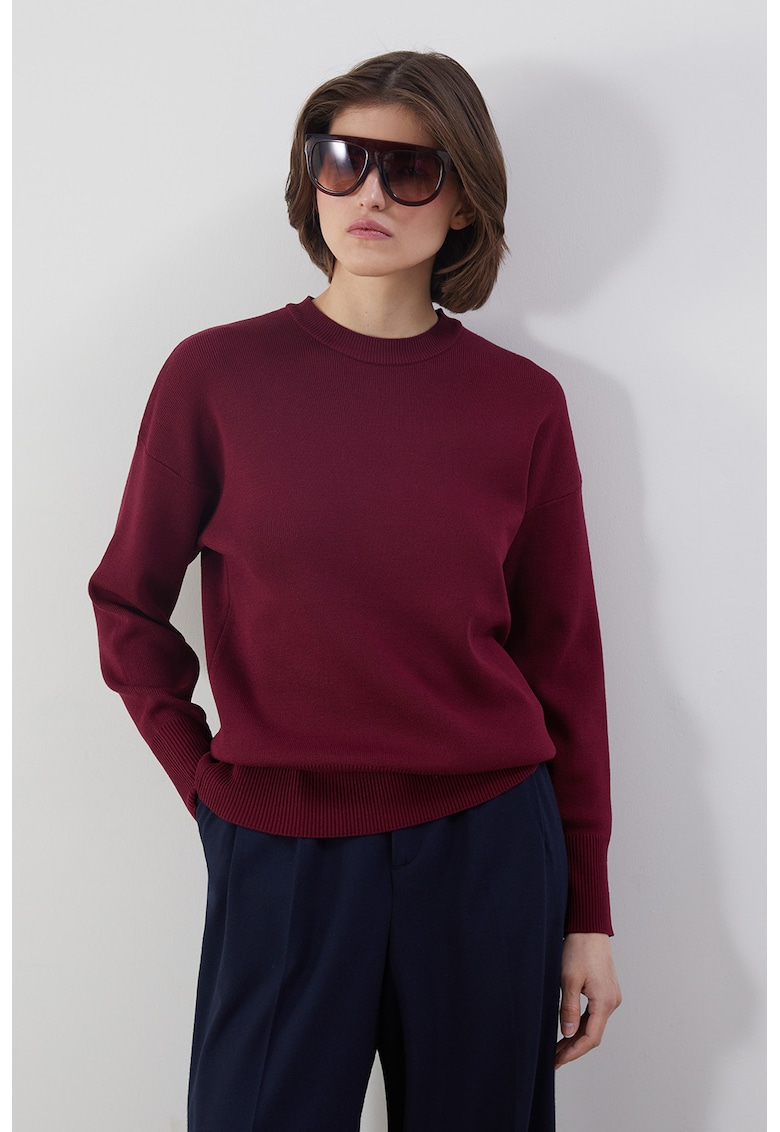 Caracteristici Tip produs: pulover Culoare: rosu inchis Imprimeu: uni Material: poliester