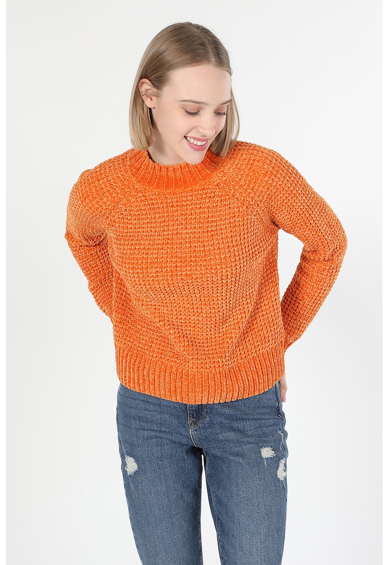 Caracteristici Tip produs: pulover Culoare: portocaliu Imprimeu: uni Material: poliester Model: decolteu la baza gatului Croiala: regular fit Sistem inchidere: fara inchidere Lungime maneca: maneca lunga Tip maneca: raglan Detalii: aspect catifelat