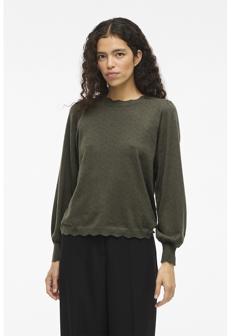 - tricot Model: decolteu la baza gatului Croiala: regular fit Sistem inchidere: fara inchidere Lungime maneca: maneca lunga Detalii: model pointelle