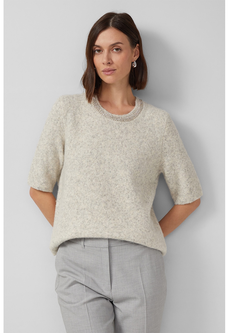 - poliacril Model: decolteu la baza gatului Croiala: regular fit Sistem inchidere: fara inchidere Decolteu: aplicatii cu strasuri Lungime maneca: maneca medie Compozitie Exterior: 42% poliamida