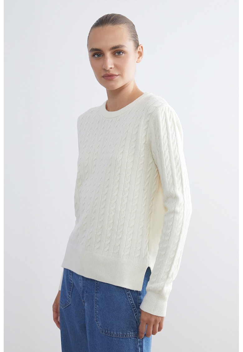 - acril Model: decolteu la baza gatului Croiala: regular fit Sistem inchidere: fara inchidere Lungime maneca: maneca lunga Detalii: design cu torsade Compozitie Exterior: 70% poliester