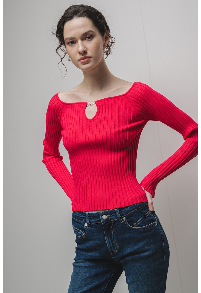 Caracteristici Tip produs: pulover Culoare: rosu capsuna Imprimeu: uni Material: sintetic Model: barcuta Croiala: regular fit Sistem inchidere: fara inchidere Lungime maneca: maneca lunga Detalii: aspect striat Compozitie Exterior: 70% viscoza