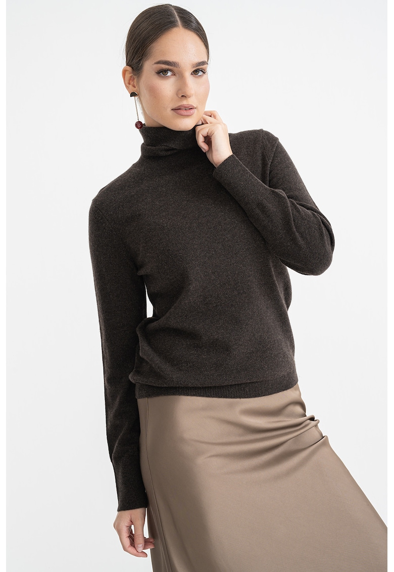 Caracteristici Tip produs: pulover Culoare: maro inchis Imprimeu: uni Material: lana Model: guler inalt Croiala: regular fit Sistem inchidere: fara inchidere Lungime maneca: maneca lunga Compozitie Exterior: 100% lana Info model Modelul poarta un produs de marimea S. Marimi model: 176 cm inaltime