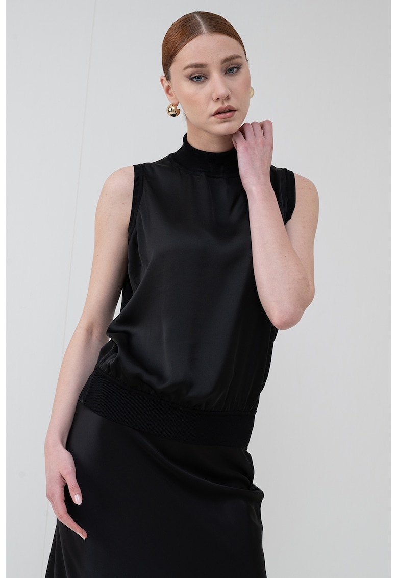 Caracteristici Culoare: negru Imprimeu: uni Stil: elegant Croiala: lejer Sistem inchidere: fara inchidere Material: sintetic Guler: inalt Lungime maneca: fara maneca Compozitie Exterior: 100% poliester Info model Modelul poarta un produs de marimea S. Marimi model: 180 cm inaltime
