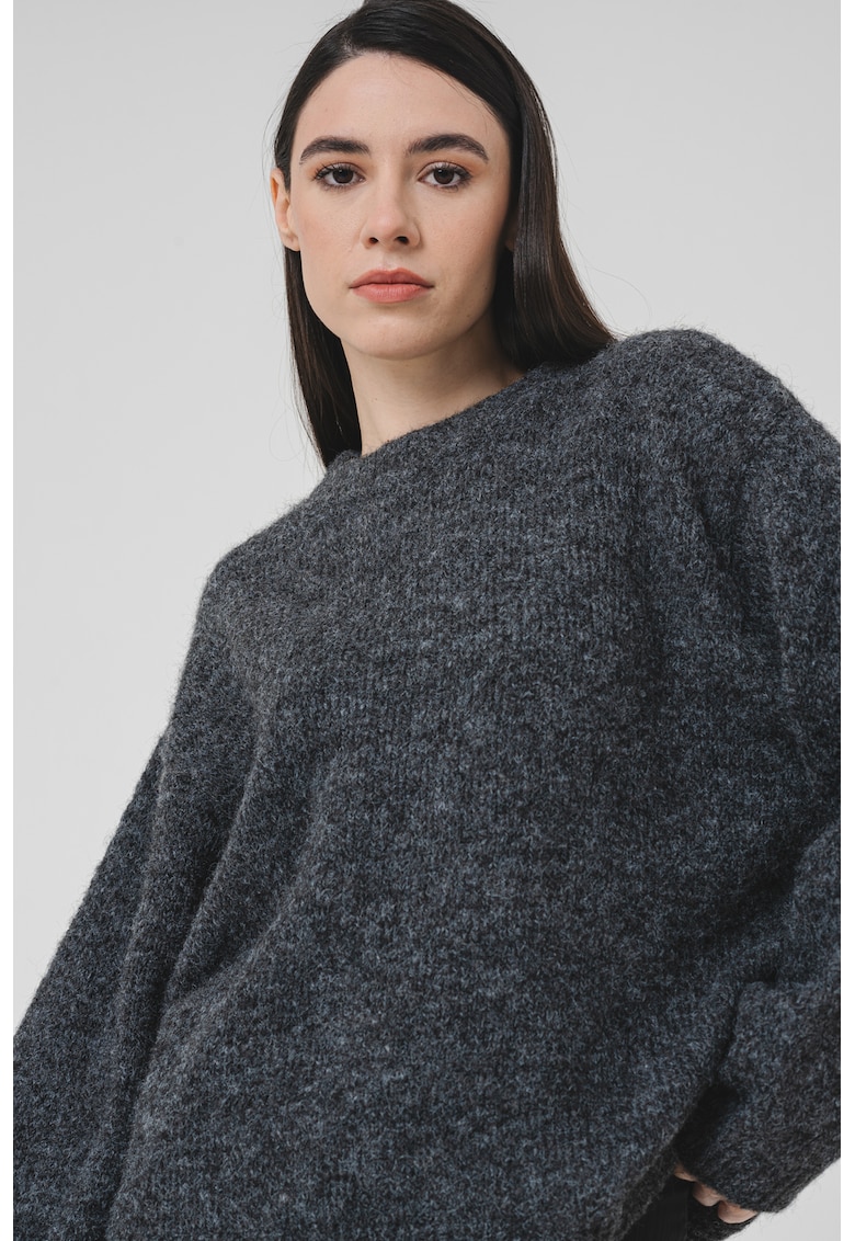 Caracteristici Tip produs: pulover Culoare: gri inchis Imprimeu: uni Material: viscoza Model: decolteu la baza gatului Croiala: lejer Lungime maneca: maneca lunga Tip maneca: cazuta Compozitie Exterior: 50% viscoza
