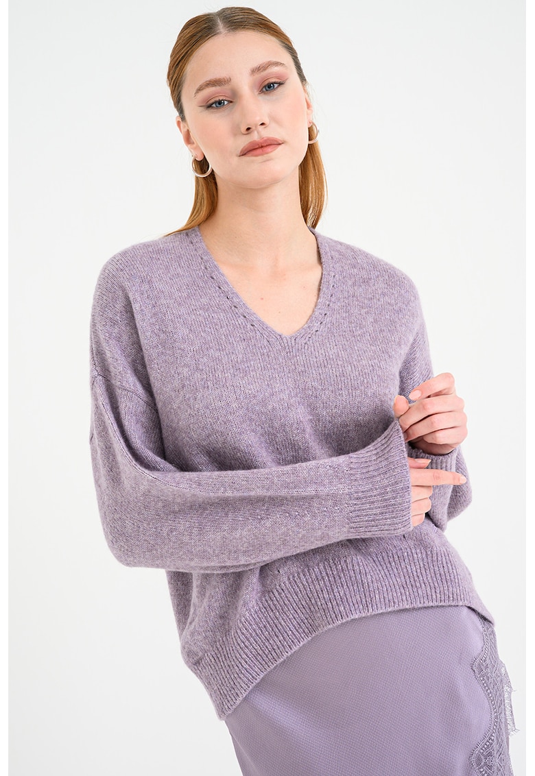 Caracteristici Tip produs: pulover Culoare: liliac prafuit Imprimeu: uni Material: lana