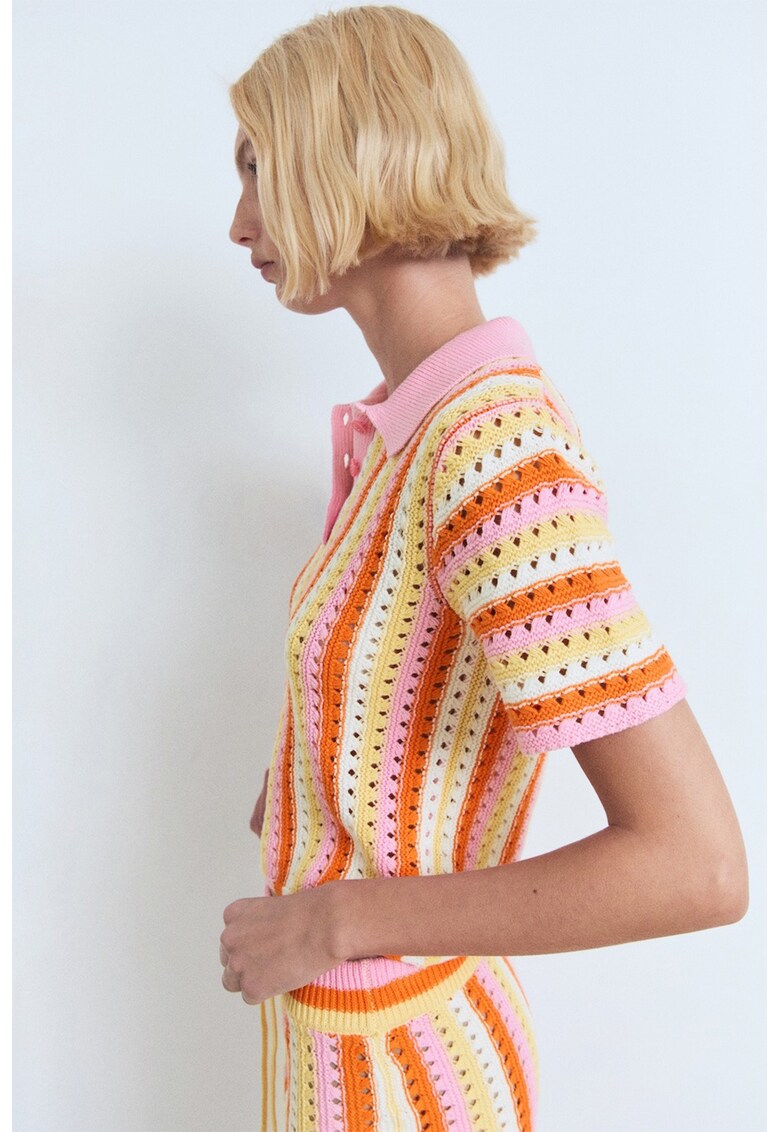 - portocaliu mandarina Imprimeu: dungi Material: bumbac Model: decolteu la baza gatului Croiala: crop Sistem inchidere: fara inchidere Decolteu: polo Lungime maneca: maneca scurta Detalii: aspect perforat Compozitie Exterior: 100% bumbac