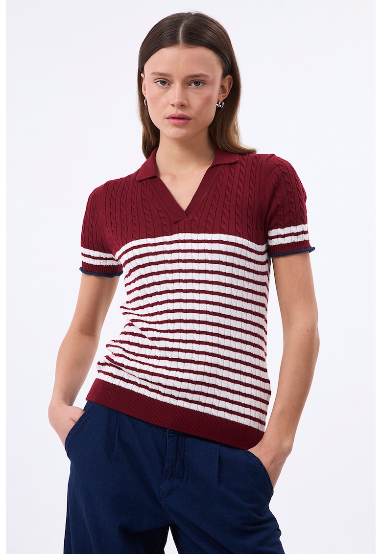 - acril Model: in v Croiala: regular fit Sistem inchidere: fara inchidere Decolteu: in v Lungime maneca: maneca scurta Guler: polo Detalii: design cu torsade Compozitie Exterior: 50% bumbac