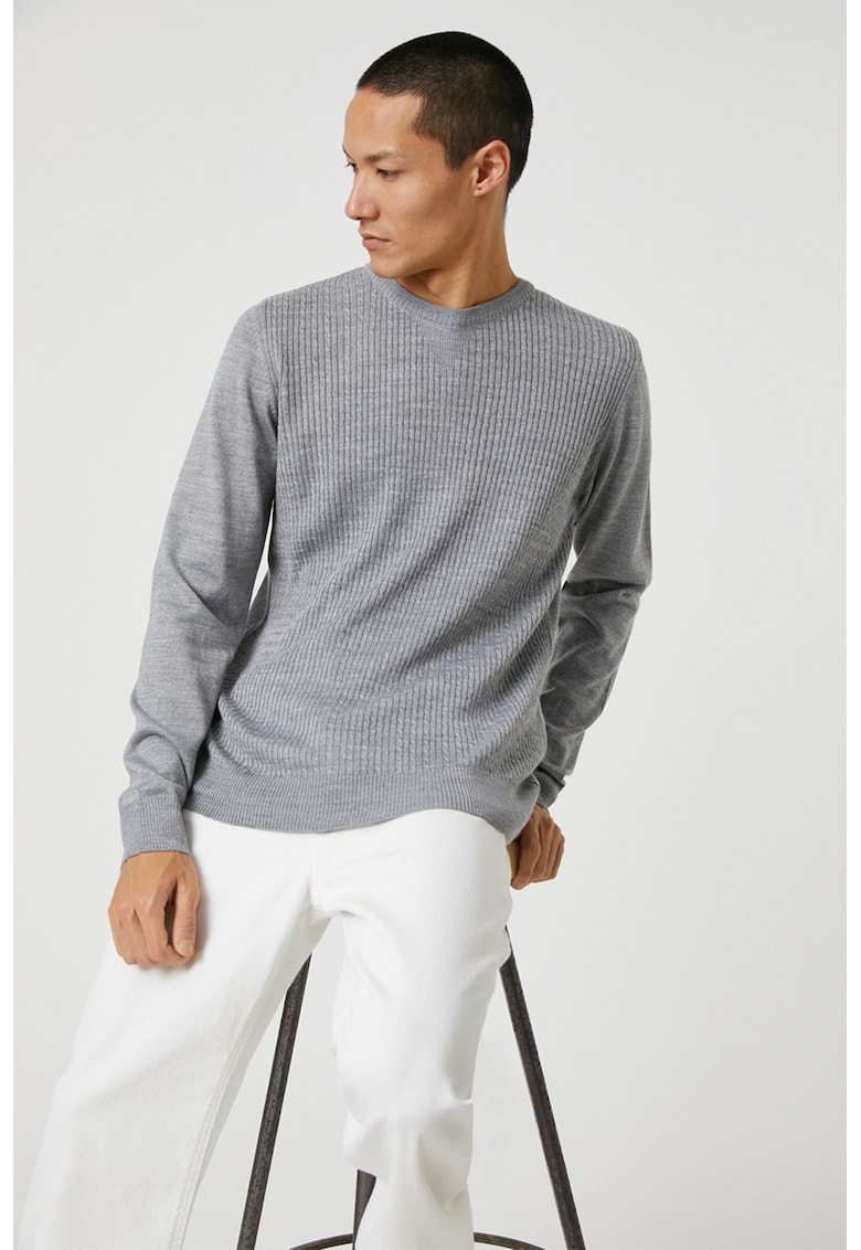 Caracteristici Culoare: gri melange Imprimeu: uni Material: tricot Croiala: regular fit Sistem inchidere: fara inchidere Model: decolteu la baza gatului Lungime maneca: maneca lunga Detalii: aspect striat Compozitie Exterior: 90% acrilic