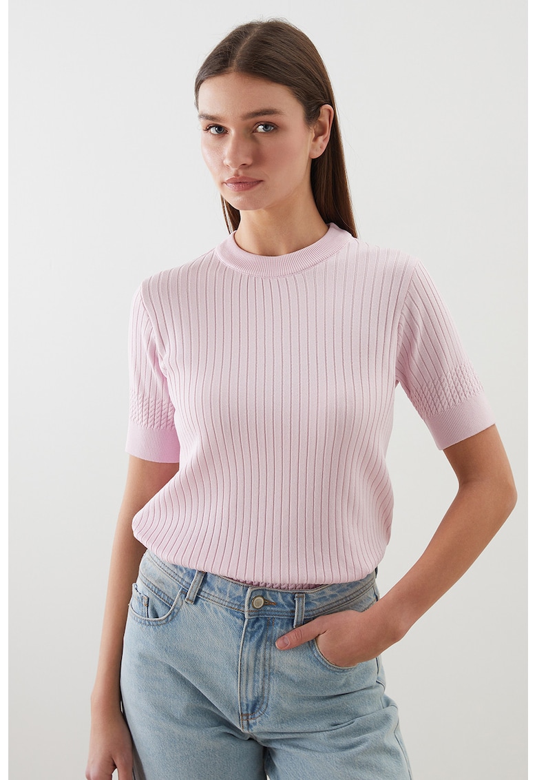 - viscoza Model: decolteu la baza gatului Croiala: slim fit Sistem inchidere: fara inchidere Decolteu: striat Lungime maneca: maneca scurta Detalii: aspect striat Compozitie Exterior: 73% viscoza
