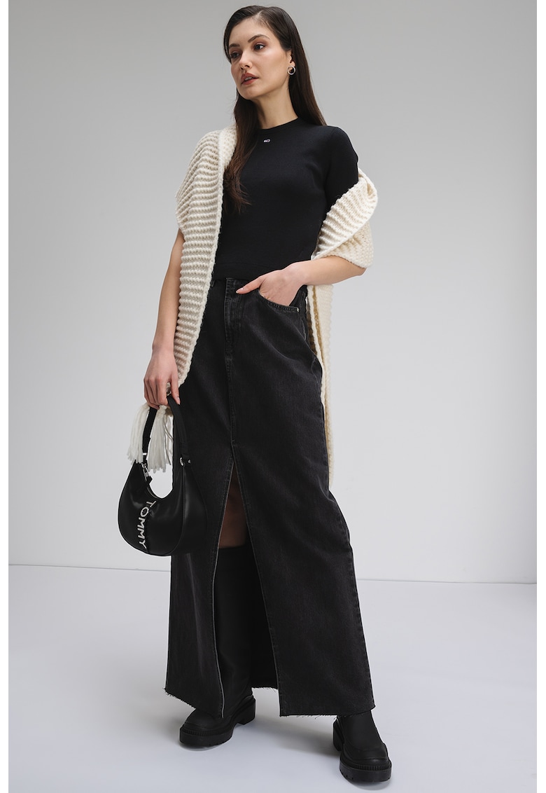 Caracteristici Tip produs: pulover Culoare: negru Imprimeu: uni Material: bumbac Model: decolteu la baza gatului Croiala: slim fit Sistem inchidere: fara inchidere Lungime maneca: maneca scurta Detalii: aspect de tricot fin Compozitie Exterior: 100% bumbac Info model Modelul poarta un produs de marimea S. Marimi model: 176 cm inaltime