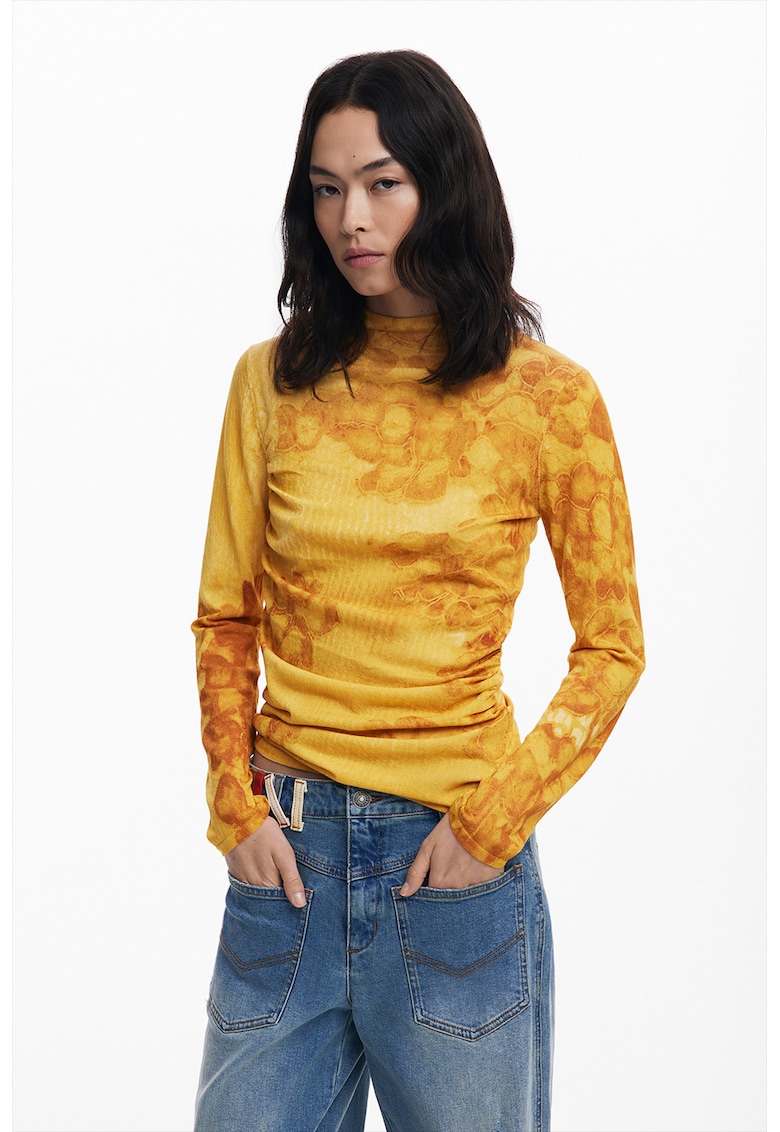 Caracteristici Tip produs: pulover Culoare: galben sofran Imprimeu: floral Material: sintetic Model: decolteu la baza gatului Croiala: regular fit Sistem inchidere: fara inchidere Lungime maneca: maneca lunga Compozitie Exterior: 62% viscoza