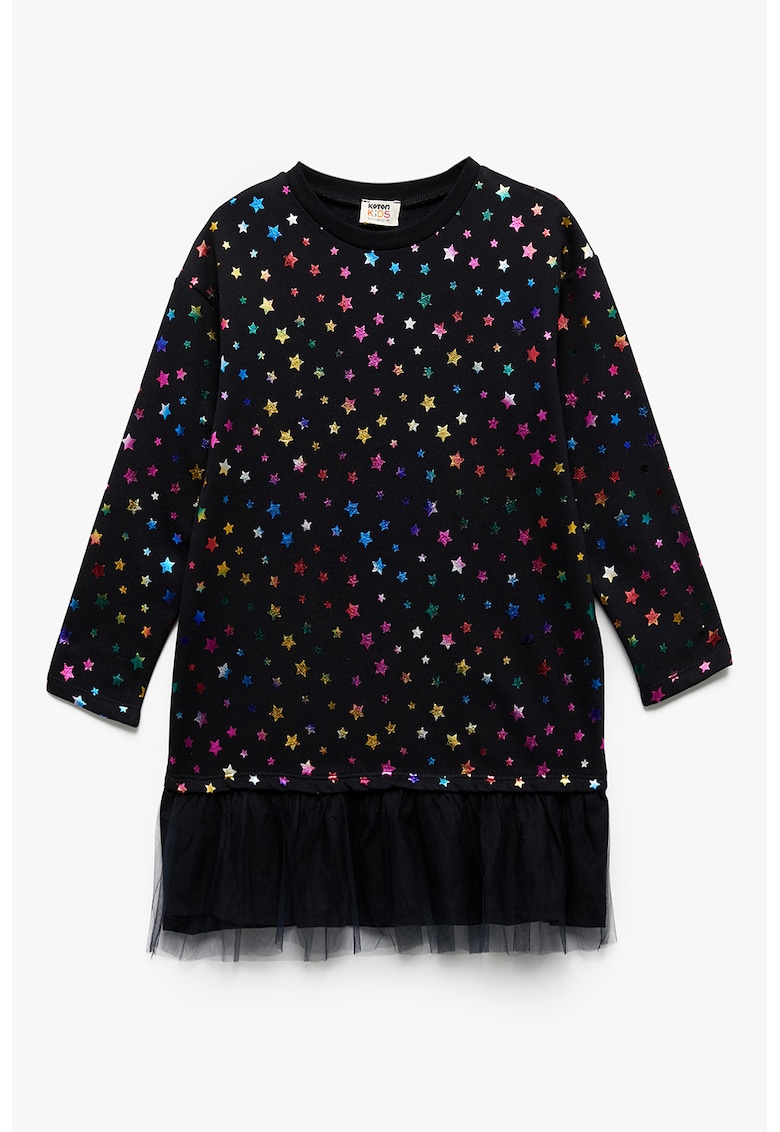 Caracteristici Culoare: albastru ultramarin Stil: casual Material: bumbac Imprimeu: stelute Croiala: dreapta Lungime maneca: maneca lunga Stil decolteu: rotund Detalii: aplicatie din tul Colectie: primavara