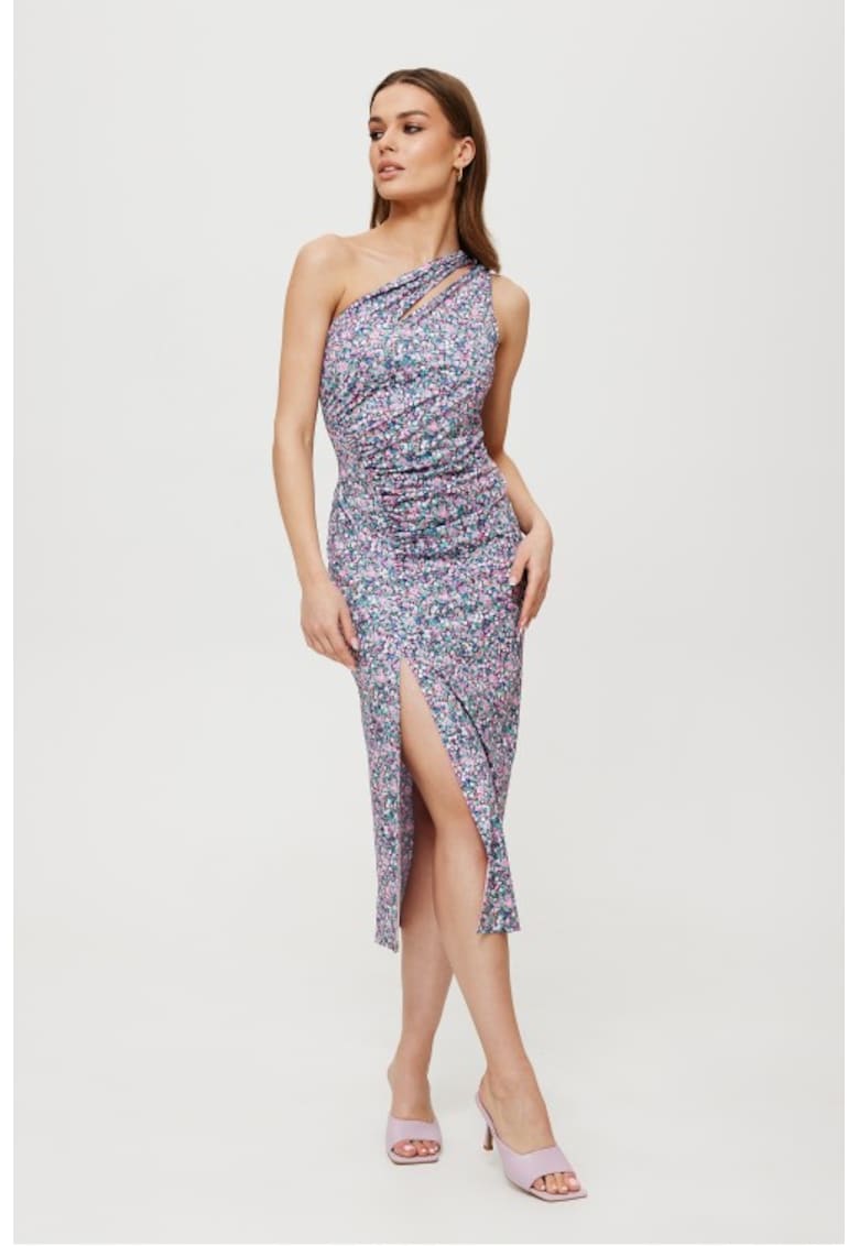 - elastan Imprimeu: floral Croiala: bodycon Lungime: midi Decolteu: decolteu pe un umar Lungime maneca: fara maneca Detalii: produs in europa Compozitie Exterior: 95% poliester