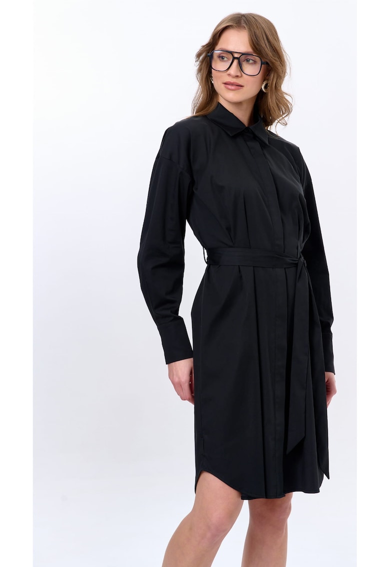 Caracteristici Culoare: negru Stil: casual Material: bumbac Imprimeu: uni Croiala: evazat Lungime: scurta Guler: clasic Maneci: cu mansete cu nasturi Lungime maneca: maneca lunga Talie: inalta Detalii: cordon in talie Sistem inchidere: nasturi Compozitie Exterior: 69% bumbac