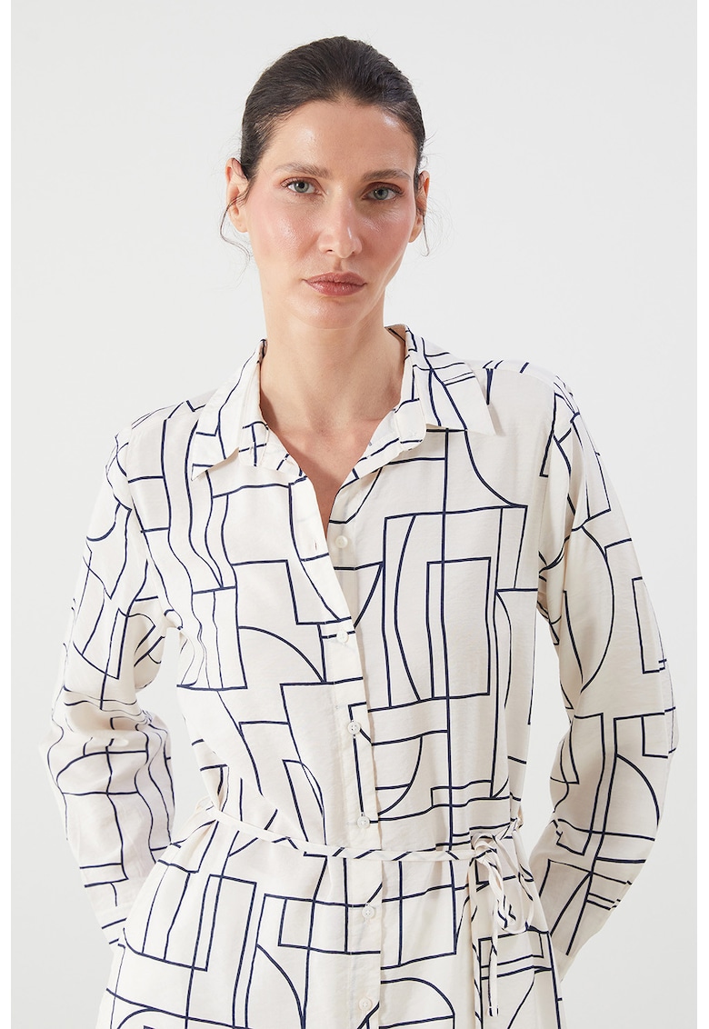 - poliamida Imprimeu: geometric Croiala: in a Lungime: midi Lungime maneca: maneca lunga Sistem inchidere: nasturi Compozitie Exterior: 87% viscoza