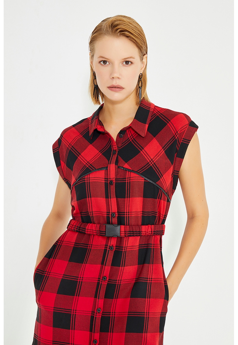 - viscoza Imprimeu: carouri Croiala: dreapta Lungime: midi Guler: ascutit Lungime maneca: maneca scurta Sistem inchidere: nasturi Compozitie Exterior: 65% poliester