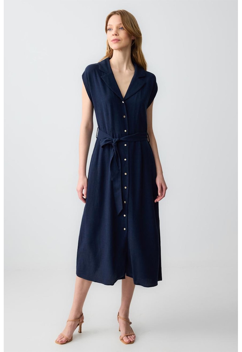 - in Imprimeu: uni Croiala: evazat Lungime: midi Guler: cu revere Maneci: kimono Lungime maneca: maneca scurta Buzunare: in cusaturile laterale Detalii: cordon asortat Sistem inchidere: nasturi Compozitie Exterior: 72% viscoza