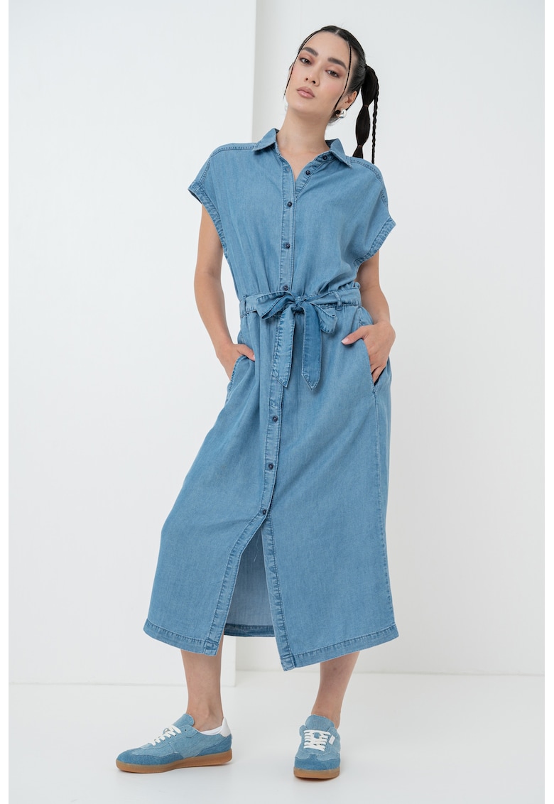 Caracteristici Culoare: albastru prafuit Stil: casual Material: lyocell Imprimeu: uni Croiala: dreapta Lungime: midi Guler: clasic Maneci: kimono Lungime maneca: maneca scurta Talie: elastica Buzunare: in cusaturile laterale Detalii: cordon asortat Sistem inchidere: nasturi Compozitie Exterior: 100% lyocell Info model Modelul poarta un produs de marimea S. Marimi model: 170 cm inaltime
