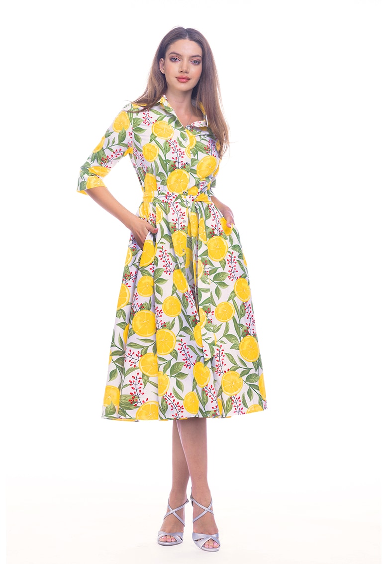 - galben Stil: casual Material: bumbac Imprimeu: fructe Croiala: evazat Lungime: midi Guler: clasic Lungime maneca: maneca trei sferturi Detalii: cordon in talie Sistem inchidere: nasturi Compozitie Exterior: 100% bumbac