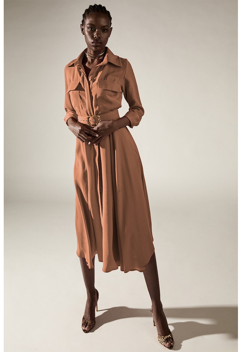 Caracteristici Culoare: caramel Stil: casual Material: viscoza Imprimeu: uni Croiala: evazat Lungime: midi Guler: ascutit cu decupaj in v Lungime maneca: maneca lunga Buzunare: 2 Sistem inchidere: nasturi Compozitie Exterior: 90% viscoza